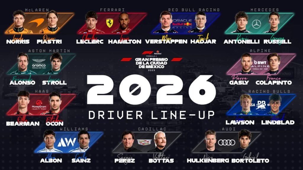 De esta manera no habran grandes cambios en la parrilla de salida, pues la mayoría de los equipos repetirán a los mismos pilotos que compitieron este año. Los cambios mas significativos, son el regreso de Valteri Bottas y Checo Perez para el flamante equipo Cadillac y el ascenso a RB del piloto Britanico Arvid Lindblad como compañero de Liam Lawson y el “ascenso” de Isaac Hadjar como segundo piloto de Red Bull Racing como compañero de Max Verstappen. Y aquí vale una aclaración de porque ponemos “ascenso” asi con comillas, dado que el segundo auto de Red Bull fue un domador de domadores, dado que, los resultados de la ultima época de Checo en Red Bull no fueron los esperados, lo que motivo la llegada de Liam Lawson, el cual tampoco cumplio con las expectativas de Helmut Marko, lo cual apuro el ascenso del Japones Yuki Tsunoda, el cual en varios grandes premios estuvo peleando posiciones con los Alpine, consensuadamente los peores autos de la grilla.